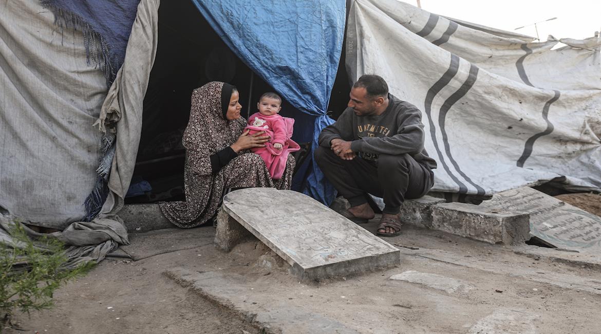 النازح خالد الزعانين يعيش مع أسرته في ظروف غير إنسانية في خيمة داخل مقبرة بدير البلح وسط قطاع غزة، بعد نزوحه من بيت حانون