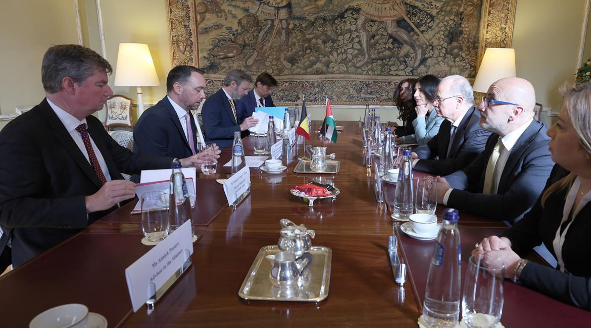 رئيس الوزراء محمد مصطفى خلال كلمتة في الاجتماع التاسع للتحالف الدولي لتنفيذ حل الدولتين الذي عقد في العاصمة البلجيكية بروكسل