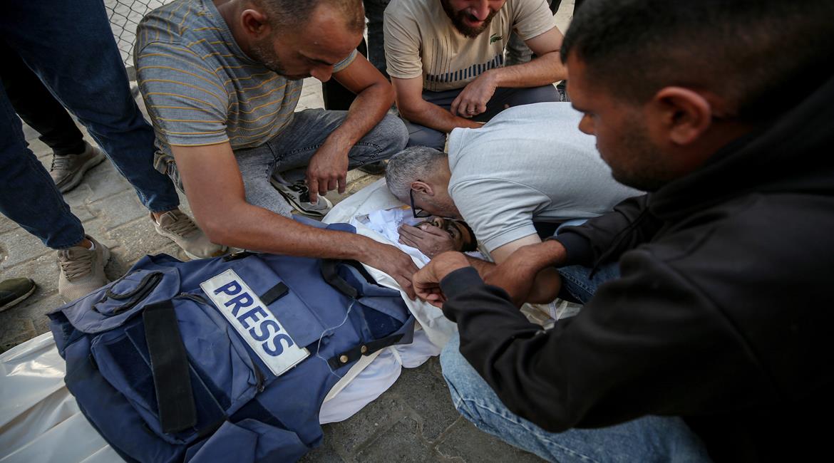 وداع وتشييع الصحفي أحمد أبو مطر الذي ارتقى بغارة اسرائيلية على منزل يسكنه الصحفيين في بلدة الزوايدة وسط قطاع غزة