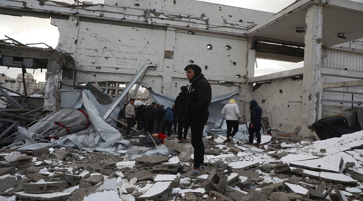 مواطنون يتفقدون مكان استشهاد 4 مواطنين جراء إنهيار مبانٍ كانت متضررة بفعل العدوان الإسرائيلي بسبب شدة الرياح والأمطار في مدينة غزة
