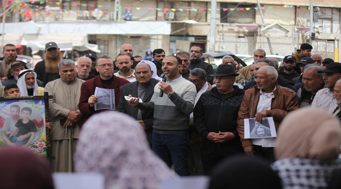 مواطنون يشاركون في وقفة احتجاجية عند مدخل مخيم النصيرات وسط قطاع غزة، رفضا لإقرار قانون إسرائيلي يقضي بعقوبة الإعدام بحق الأسرى الفلسطينيين.