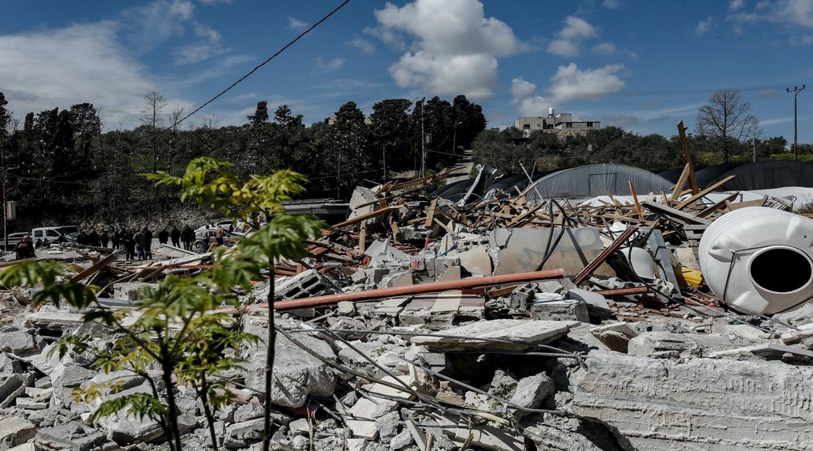 مواطنون يتفقدون أنقاض منزل ومتجر هدمتهما جرافات الاحتلال بدعوى البناء دون ترخيص، في قرية الزاوية جنوب جنين