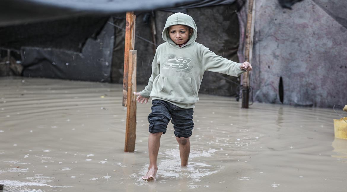 نازحون يعانون من الفيضانات بعد هطول أمطار غزيرة على مخيم النصيرات، وسط قطاع غزة