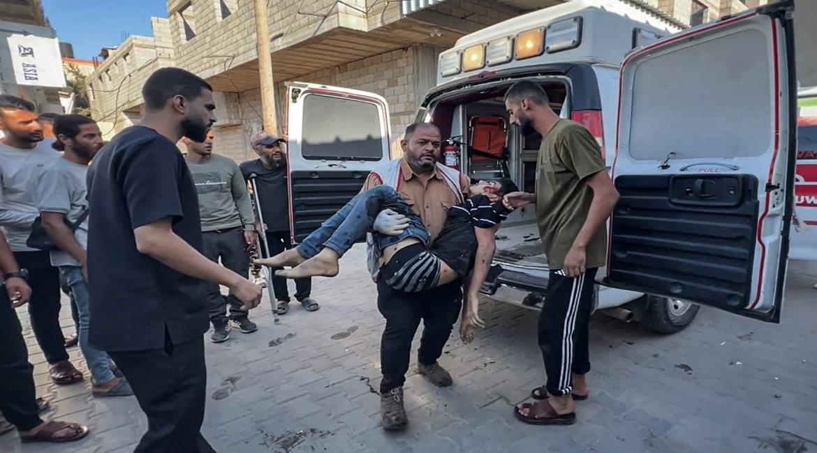 مواطنون ينقلون شهداء ومصابين إلى مستشفى العودة في مخيم النصيرات وسط قطاع غزة عقب استهدافهم بطائرة مسيّرة إسرائيلية