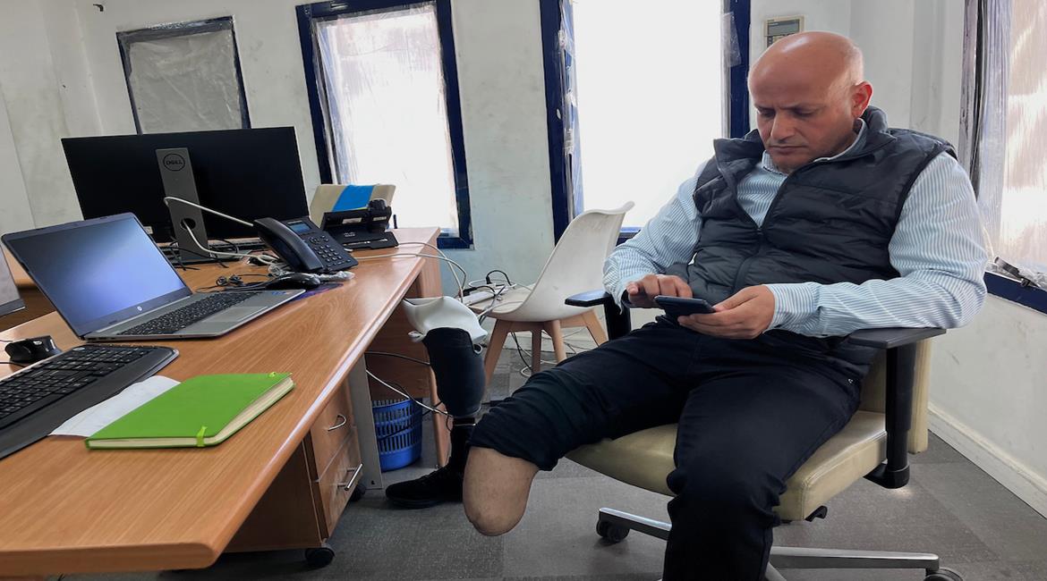 عامر الزعيم يعود إلى عمله في شركة اتصالات بغزة بعد أن فقد ساقه في قصف الاحتلال خلال عدوانه على القطاع