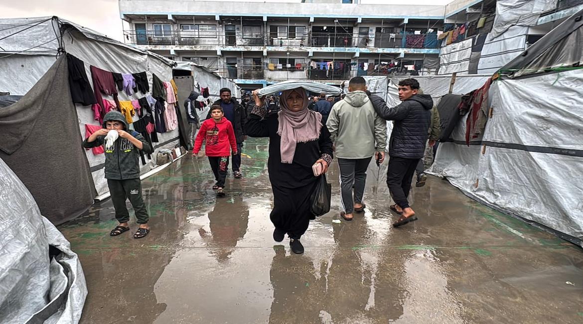 مواطنون يتجمعون في طابور للحصول على الشوادر من مركز توزيع تابع للأونروا في دير البلح في وسط قطاع غزة