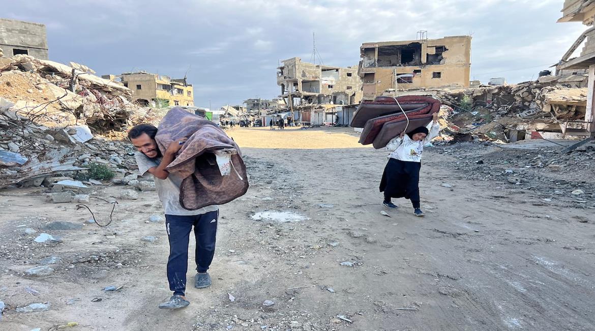 نازحون في منطقة الزنة شرق خان يونس يحاولون الحصول على ما استطاعوا انتشاله من بين أنقاض منازلهم المدمرة