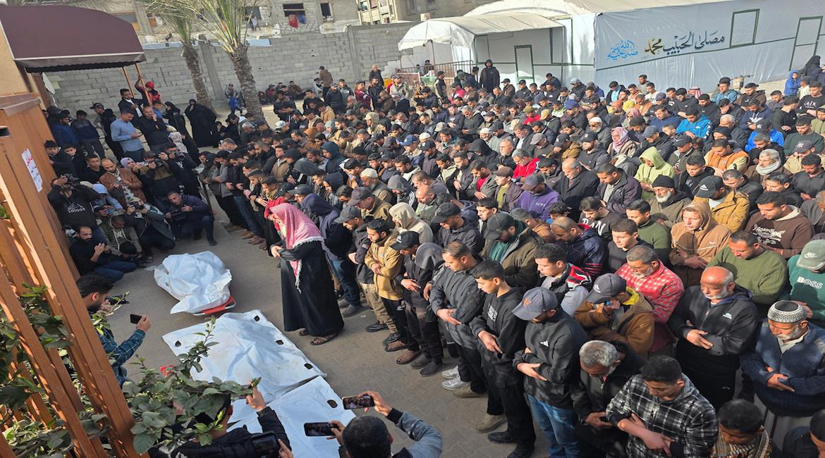 وداع وتشييع خمسة شهداء في مستشفى ناصر بمدينة خان يونس ارتقوا جراء القصف الاسرائيلي على المدينة