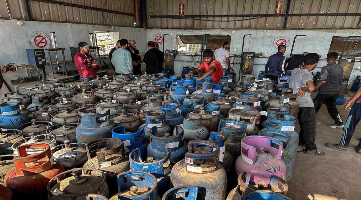 مواطنون يتوافدون لتعبئة أسطوانات غاز الطهي في محطة تعبئة بالنصيرات، وسط قطاع غزة، في وقت يعاني فيه القطاع من أزمة حادة في إمدادات الوقود