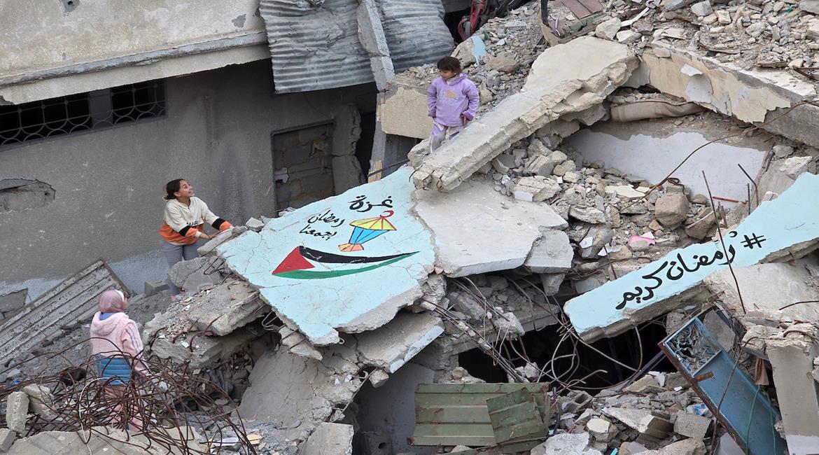 متطوعون من الأهالي بينهم أطفال يقومون بتنظيف وتزيين أحد أحياء خان يونس رغم الدمار الذي خلّفه العدوان على غزة