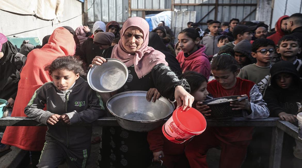مواطنون يتجمعون للحصول على وجبات طعام مجانية من إحدى التكيات الخيرية في مخيم النصيرات وسط قطاع غزة